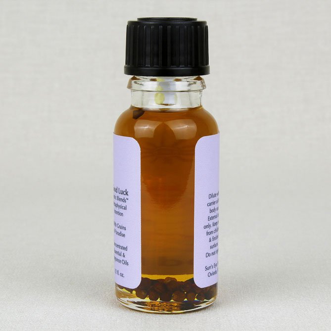 The Good Luck Oil includes Grains of Paradise to encourage good fortune through psychic development. This oil has a base note of Vanilla with fruity top notes.